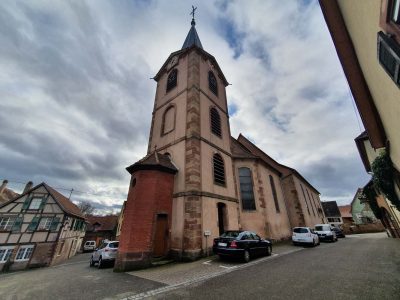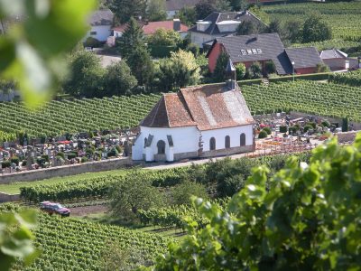 Blottie dans un écrin de vignes au lieu-dit Le Canal, cet édifice date du 15e siècle, mais elle est mentionnée dès 1342. Elle se situe au milieu du cimetière et se compose d’une nef et d’un choeur hexagonal. A l’intérieur se trouve encore 2 tableaux de Carola Sorg (1833-1923). Il y a également une statue de Saint Denis avec 2 têtes et une pierre tombale dans le sol dédiée à la femme du meunier. La chapelle a été rénovée en 2000 par des bénévoles.