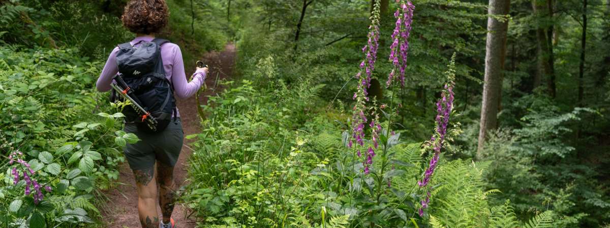 Sentier de randonnée en forêt en direction des cascades du Nideck, de Luttenbach, de Weinbaechel et de Soultzbach. Ce circuit a deux autres variantes : circuit noir et rouge.