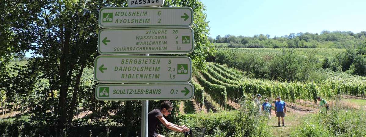Ce parcours emprunte la route des Vins d'Alsace à travers le vignoble et villages viticoles. Il suit également les sentiers de randonnées de Bacchus qui surplombent les crêtes. Un petit arrêt s'impose à Avolsheim pour visiter la chapelle Saint-Ulrich et admirer ses fresques ou l'une des plus anciennes églises d'Alsace : le Dompeter. A Soultz-les-Bains, le centre thermal permet de se relaxer à l'ombre des arbres du jardin de Sulzbad