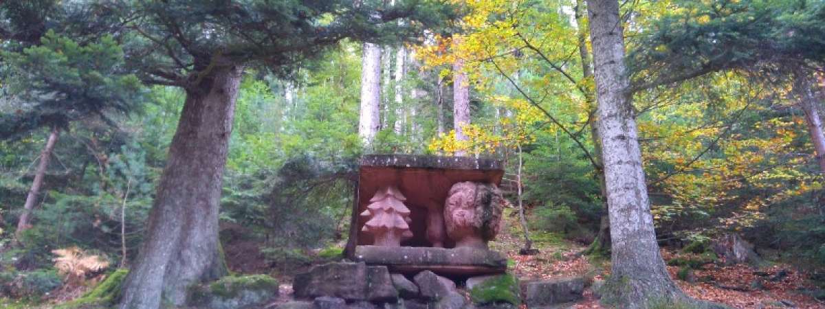 Rundgang zur Entdeckung von Kunstwerk im Wald. diese wurden während des 2003 Kunstsymposium von 8 Künstler erschaffen.