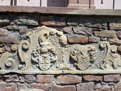 Diese im Hof der Grundschule versiegelte Komposition aus dem 16. Jahrhundert stellt die 3 Hörner der Pfaffenlapp und die 6 Kelche der Familie Landsberg dar.