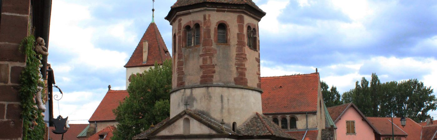 The Carolingian chapel of Avolsheim is the oldest sanctuary (9th century) still existing in Alsace and is located by the side of the former Roman road at the Vosges foothills. It has a form of a 4-leaved clover and was covered by a dome. In the Romanesque period an octagonal bell tower was added on top of on the drums of the dome.
