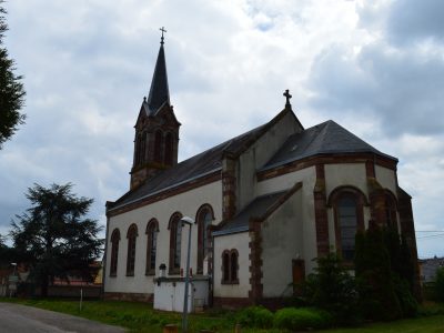 Putting an end to two centuries of simultaneum, the Catholic church was built (1887-1895) in a garden on the outskirts of the old town. This neo-Romanesque building is decorated on the façade with statues of Joan of Arc and Saint Martin. The interior is illuminated by large glass windows donated by village notables around 1912, including Baron Hervé Gruyer. Those of the choir evoke the life of Saint Laurent. The organ (1900) and one of the stained glass windows were donated by the car manufacturer Ettore Bugatti.